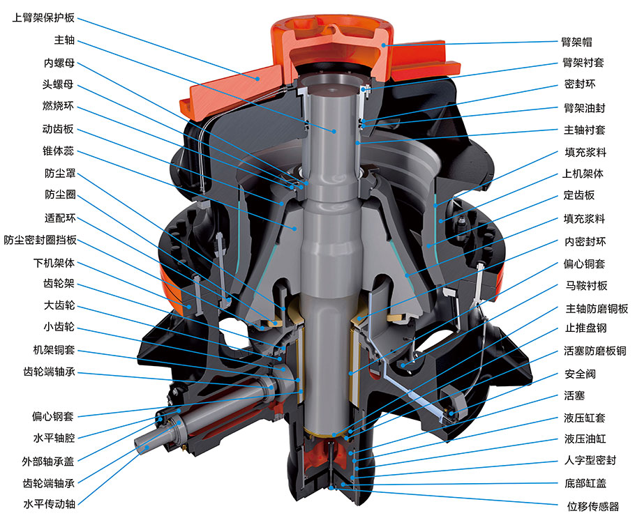 HST系列液压单缸圆锥破碎机主要由上架体、中架体(中碎型)、下架体、动锥部、偏心套部、传动部、液压缸部等部件组成。工作时,电机带动破碎机的小齿轮,小齿轮带动大齿轮,大齿轮组件(大齿轮、大齿轮架、偏心钢套)带动偏心套组件(偏心缸套、偏心铜套)和主轴组件(主轴、内锥、内锥衬板)以理论垂直线为中心,在铜衬套内公转,主轴组件在偏心铜套内以主轴的中心线可以实现自转。空机运行的时候,偏心套组件“抱着”主轴组件和随大齿轮一同公转,当物料加入到破碎腔后,主轴总成(主轴、内锥)在物料的阻力下在偏心铜套内缓慢的自转。内锥的运行轨迹看起来是在破碎腔内来回摆动,同时缓慢的旋转。物料被摆动的内锥挤压破碎。支撑套与架体连接处靠液压缸压紧,当破碎机内落入金属块等不可破碎物体时,单缸的动锥由底部液压活塞托起,起到排放口调整和过铁保护、反复起落排除堵矿的作用。从而实现连续工作,对石矿物料的破碎加工。